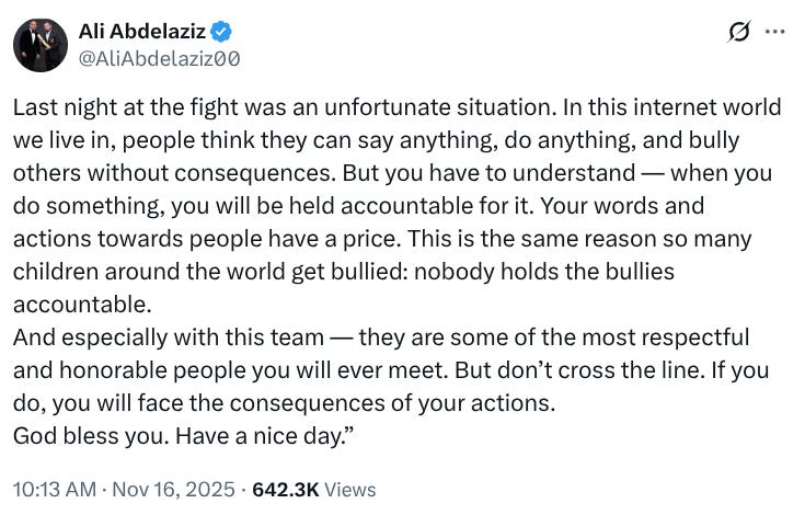 For our paid subscribers, our newest podcast discusses the increasingly high-profile nature of Ali Abdelaziz’s demonstration of raw power in the face of an ever-shrinking UFC brand ambassador Dana White.