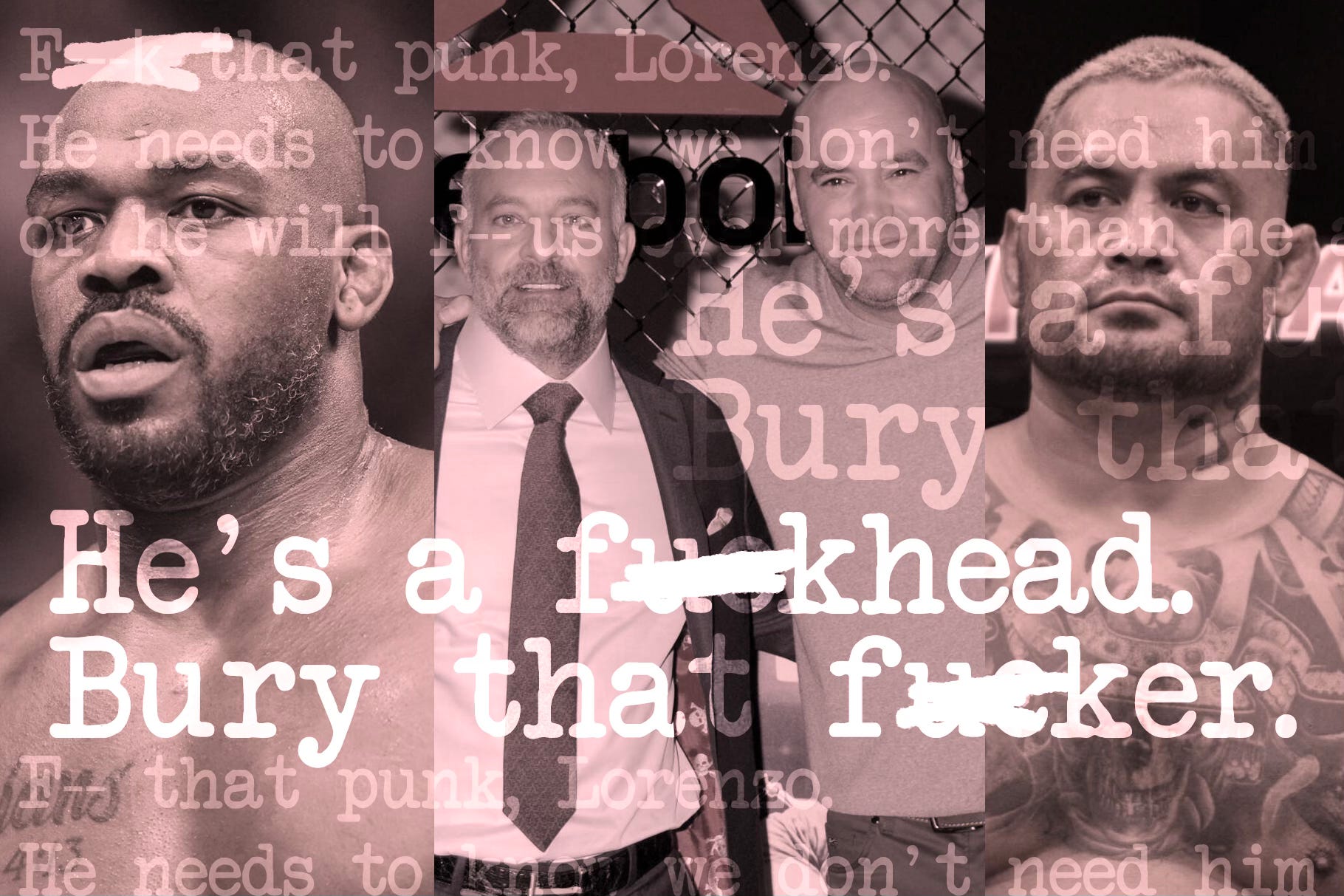 Leaked texts: Dana White trashes 'scumbag' Jon Jones, asks to 'bury' Mark HuntAnton Tabuena goes over Dana White and Lorenzo Fertitta's text messages about UFC negotiations with Jon Jones and Mark Hunt.Anton TabuenaFeb 01, 2024∙ Paid173ShareOriginal images via Photos by Louis Grasse / ZUMA Wire, Dennis Van Tine / Avalon.red, Aleksander V. Chernykh / USA TODAY Network, IMAGOThis post is for paid subscribersSubscribeAlready a paid subscriber? Sign inPreviousNext