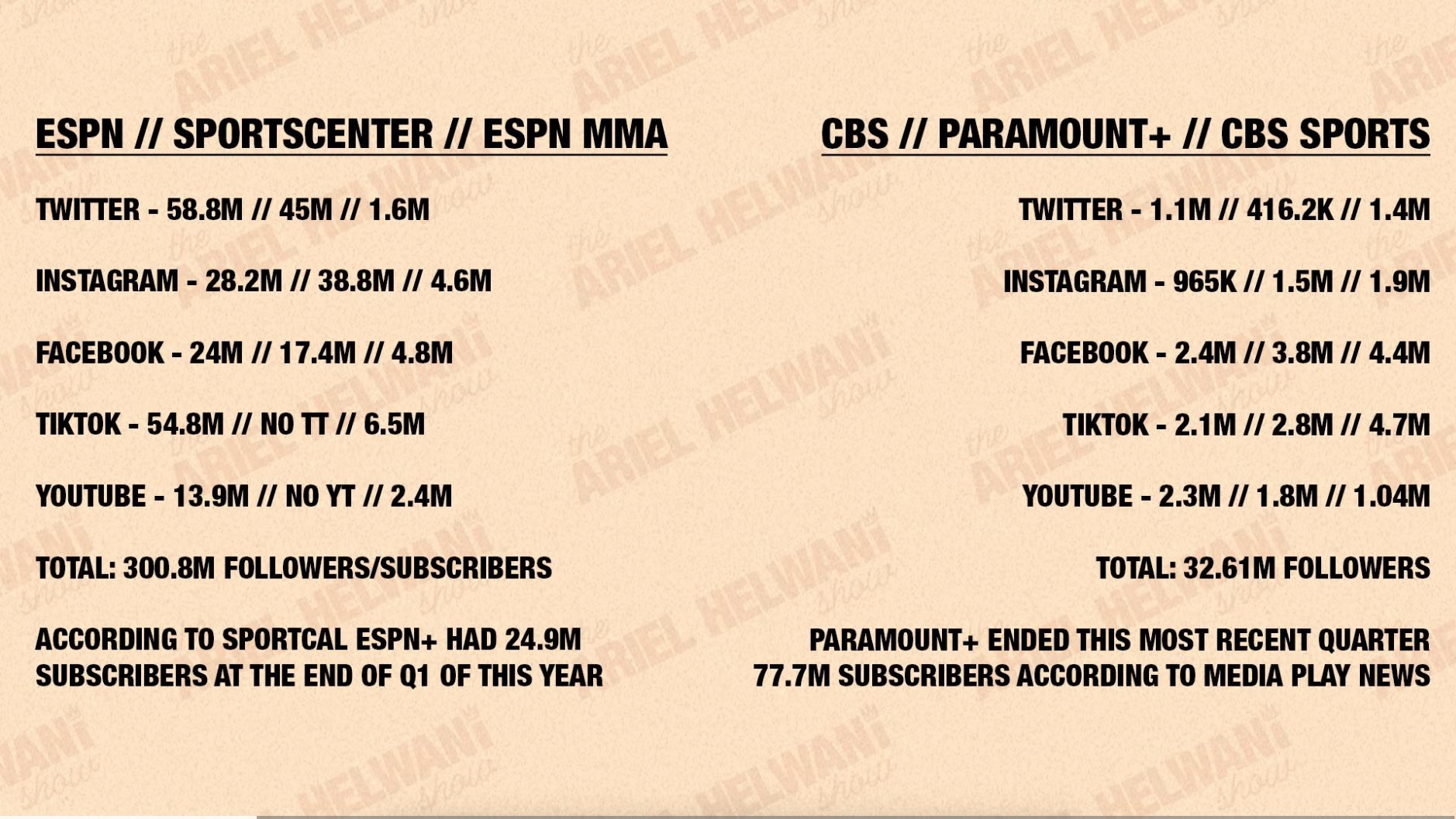 This chart from Ariel Helwani compares the social media and streaming reach of the UFC’s current partner, ESPN, with their new partner, Paramount and their broadcast network CBS. As you can see, Paramount lags ESPN on social media despite having almost 3x as many streaming subscribers.