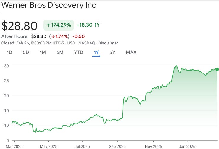 The last two years of WBD’s stock price tell the story. A stock that hit rock bottom at $8 is currently at $28 despite strong revenue headwinds. And now Paramount just bid $31 a share for it.