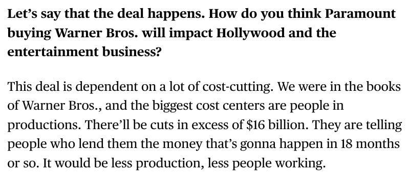 Long story short? Netflix wasn’t going to overpay. Ted Sarandos wasn’t going to fight an irrational actor like David Ellison. Most importantly, Mr. Sarandos framed Paramount’s bid as insanely over-leveraged. The cost? A lot of humans are losing their jobs. A bet against Hollywood and humanity at the expense of betting the farm on AI doing all of the work.