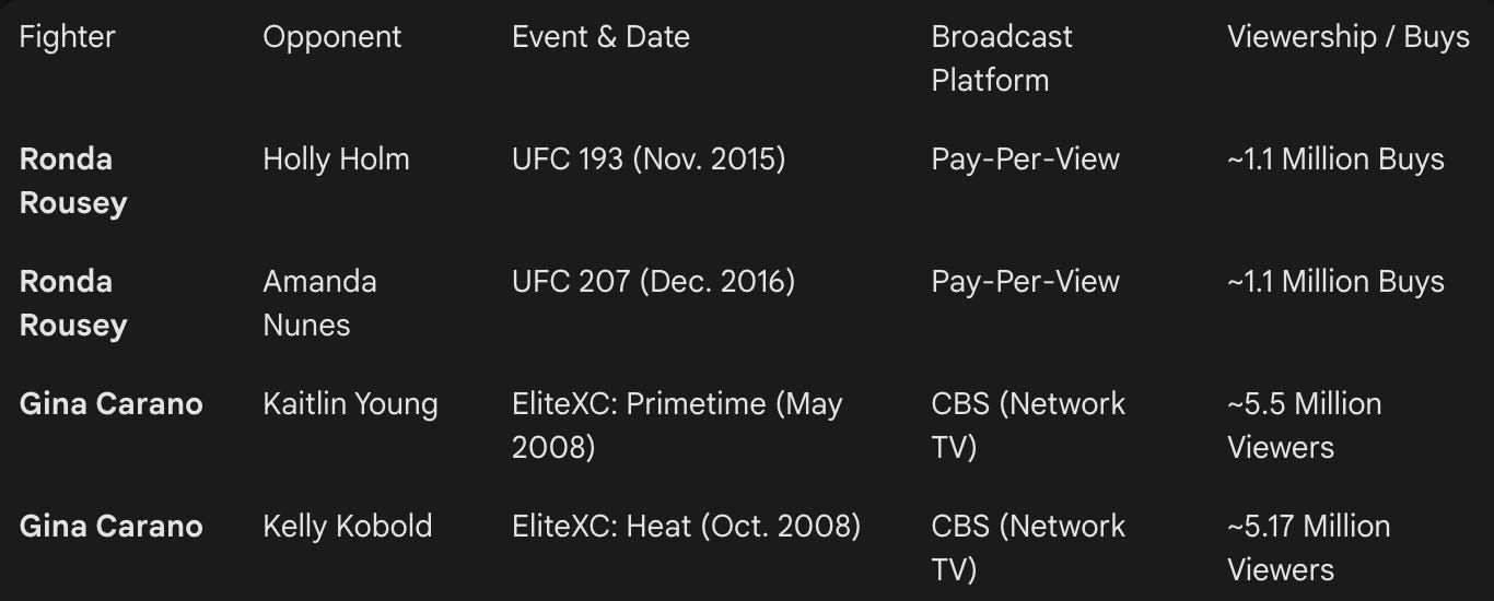 Let’s compare to Gina Carano and Ronda Rousey’s biggest fights:
