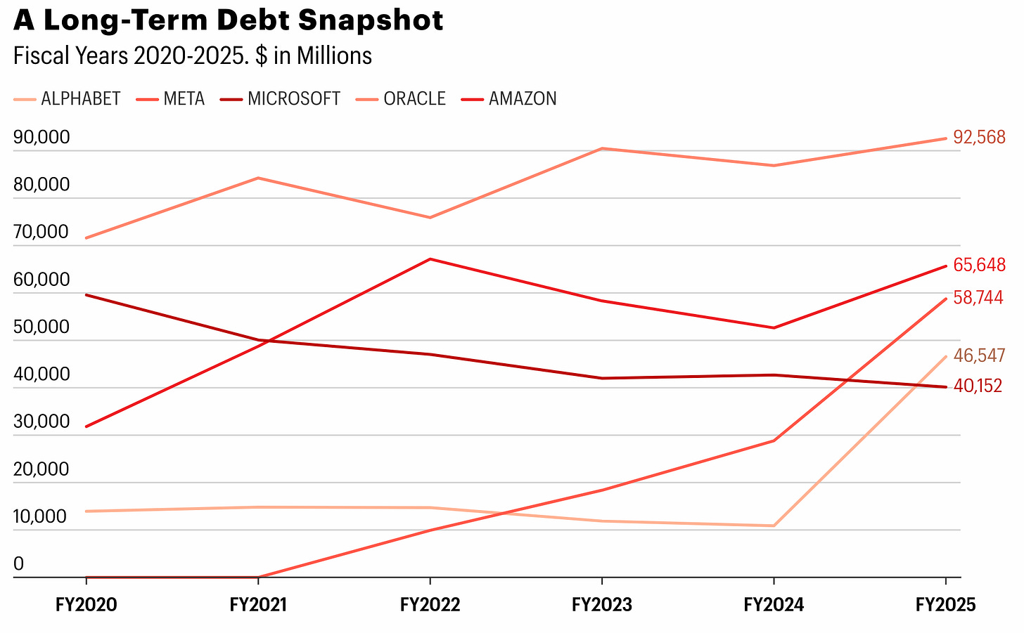It’s not just Oracle’s market cap that is way, way down. Conversely, Oracle’s corporate debt is way, way up, too. According to Fortune.com, Oracle was by far the most heavily indebted of the major tech companies competing in the cloud computing and AI data center spaces: