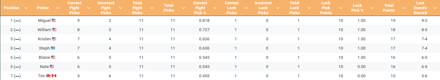 In our first picks post of this year, Miguel reigned supreme; going a very impressive 9-2. That was one better than our new boy William Watts of Open Note Grappling. How did I do? It’s not important.