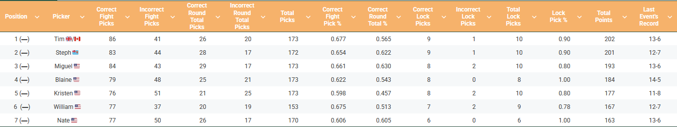 We did pretty good last week with our picks. Blaine Henry did the best, going 14-5. Blaine also hit on his lock pick (Jose Delano). He and Kristen were the only ones to hit on their locks last week, and thus earn 10 bonus points. The rest of us were suckered by Azamat Bekoev!