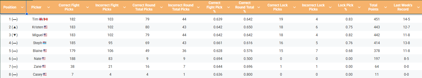 Last week’s UFC 318 card saw a lot of undercards win, that threw most of us through a bit of a loop. Not me, though! I went 14-5 last week and was the only one to pick Michael Johnson and Paulo Costa on the main card. I did miss on my lock pick, though, with Dan Ige managing to be more underwhelming than a 38 year-old Patricio Pitbull. Thankfully, that miss didn’t cost me. I’m still holding onto the top spot in our standings, Kristen is right on my tail, though!