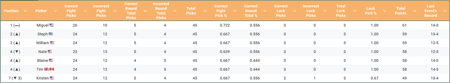 Last week we had a good showing with everyone getting at least a 12-5 record. Miguel, Blaine and I led the way, going 14-3. That keeps Miguel at the top of our leaderboard. Poor Kristen drops to the bottom (despite being 30-16), since she made Jailton Almeida her lock pick last week. She’s the first, and only, member of the crew to miss one of those.