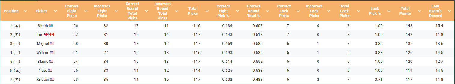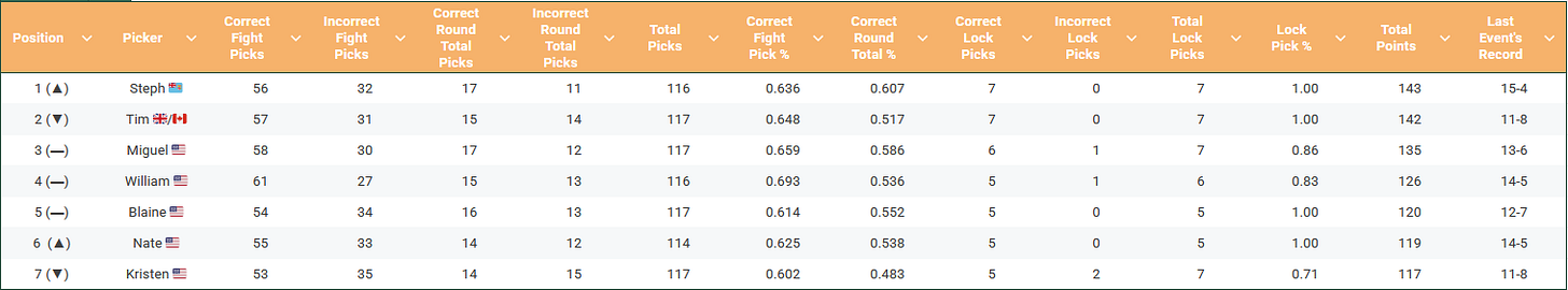 We all hit on our lock picks last night. That’s the pick we’re all super confident in and gives us 10 bonus points if we get it right. I went with Kevin Vallejos last week. I’m currently 7-0 with my lock picks.