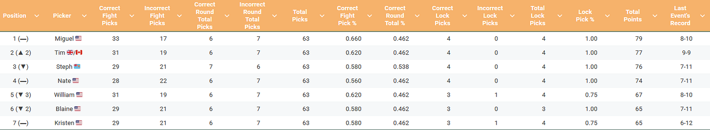Last week wasn’t pretty for us. That upset laden card resulted in me doing best overall, with just a 9-9 record. That, and my correct lock pick (Joselyne Edwards), was enough to push me up to second, though. I’m trailing Miguel. He’s been in the lead all year (not that I’m trying to jinx him or anything).