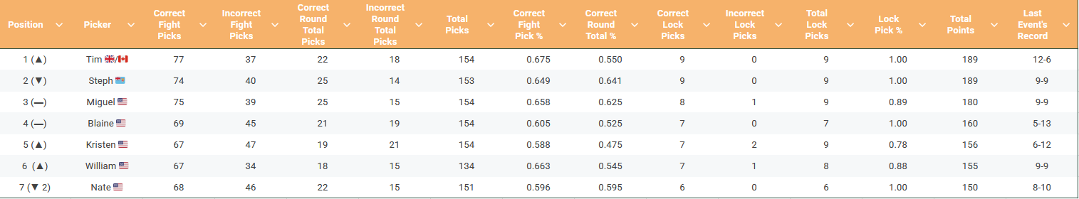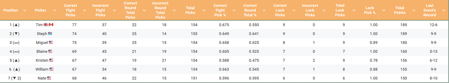 It was rough for us last week. UFC Seattle delivered a lot of action, but most of us here took some big Ls in our picks. Not me, though, I went 12-6 and used that to get back to the top of our standings. I also picked Alexa Thainara for my lock pick. She won. I’m 9-0 on those, as is Stephie (who is tied on me with points — win percentage on fight picks is our tiebreaker).