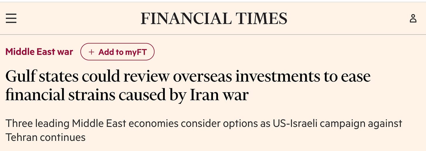 Pressure on the Gulf states’ budgets could cause them to review their overseas investments and future commitments as they consider options to ease the financial strain caused by the US-Israeli war against Iran. A Gulf official said it could have an impact on anything from investment pledges to foreign states or companies, sports sponsorships, contracts with businesses and investors, or sales of holdings.