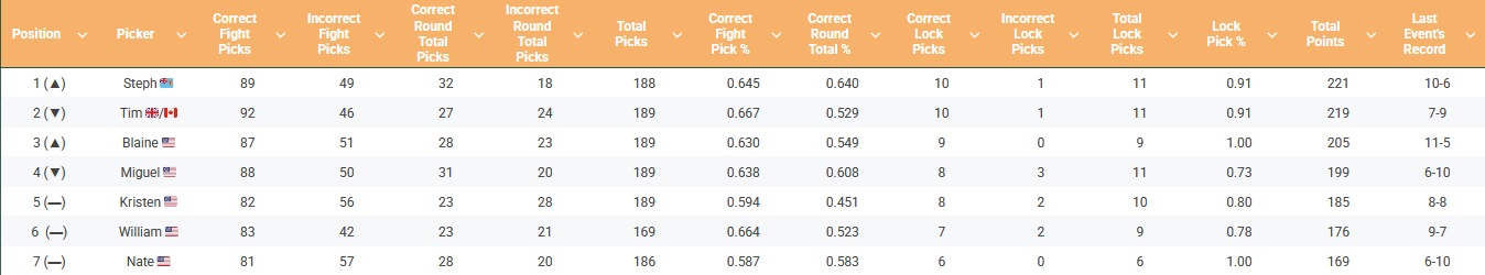 I do have the strength to sum up last week, though. We all got suckered into picking Jiri Prochazka and Azamat Murzakanov. Those losses meant most of us didn’t do great. Blaine Henry was the exception, though, going 11-6.