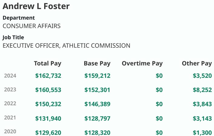 Without revenue from non-TKO combat sports events, expect several athletic commission Executive Directors/Officers to lose their jobs. These are the kinds of political appointments that pay a very healthy salary. Take a look at what Andy Foster, Executive Officer of the California State Athletic Commission, has been paid over the last five years in Sacramento (information via The Sacramento Bee):